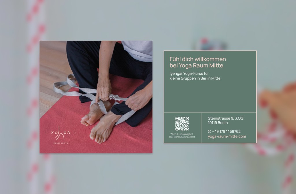 Yoga Raum Mitte is a small, ✱ intimate yoga space in Berlin Mitte where the owner teaches Iyengar yoga in a calm and personal setting. The project was developed in close collaboration with the owner, who handled the copywriting, while the communication channels and visual direction were defined as part of the design process. The resulting ✱ website and large-format business card reflect the character of the space: bright, welcoming, and peaceful—while maintaining a lively and accessible spirit rather than an exclusive atmosphere.